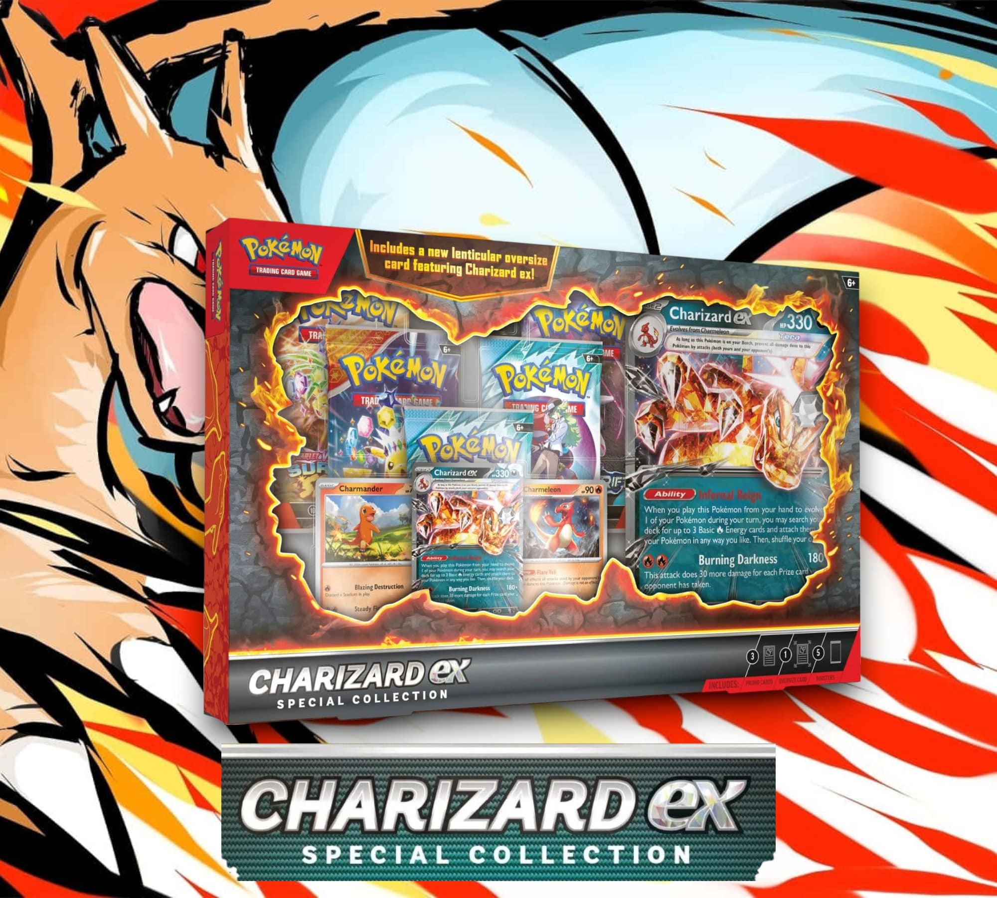 Hazlo evolucionar de Charmander y Charmeleon, utiliza la fuerza de su Habilidad y ataca para volver rugiendo al combate. Este ardiente set viene con 5 sobres de refuerzo de JCC Pokémon y 1 carta jumbo con efecto 3D del Pokémon Llama. Con solo mover esta carta impresa con tecnología lenticular, ¡podrás ver a Charizard ex lanzándose al ataque!